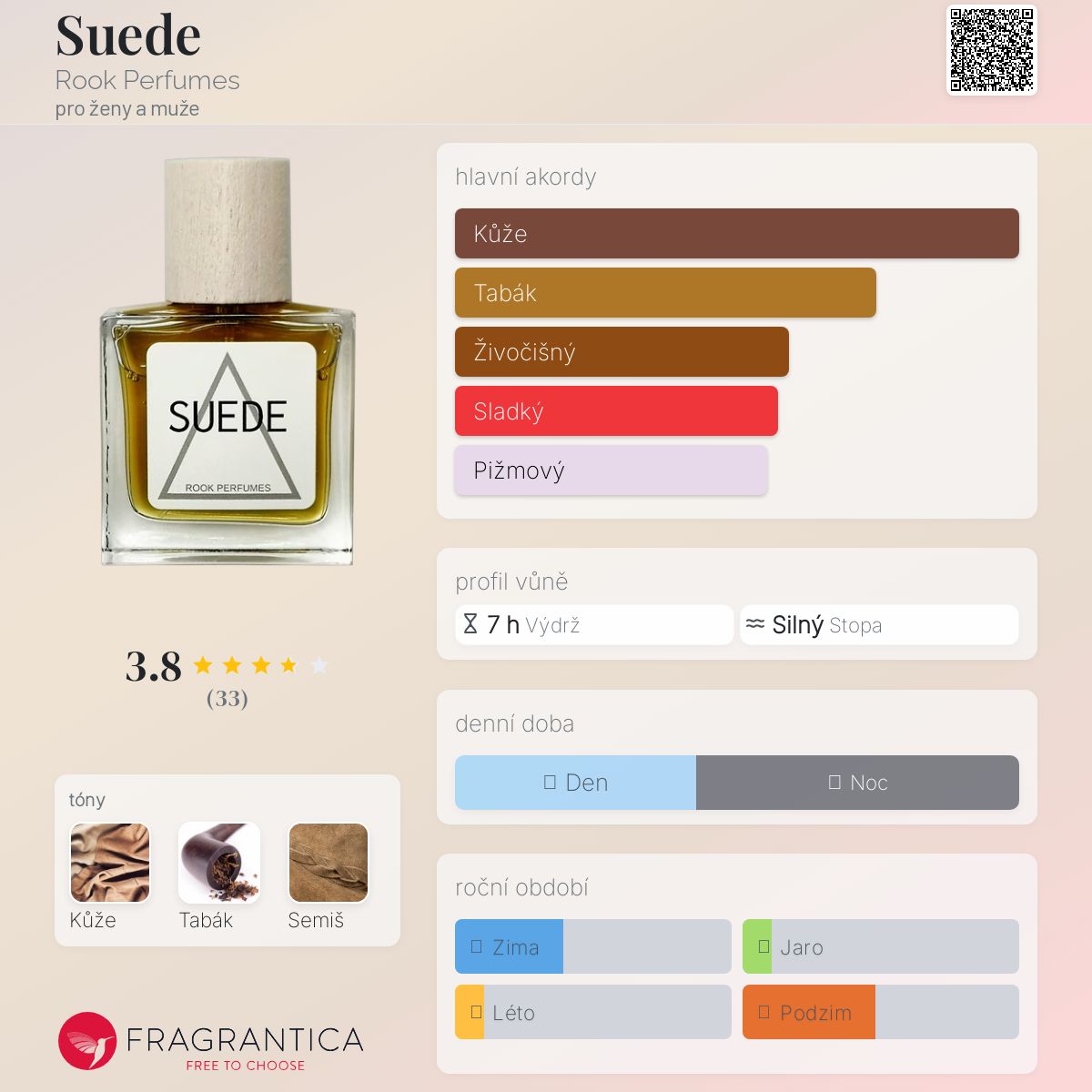 Suede podle Rook Perfumes je vůně pro ženy a muže. Suede byl/a uveden/a v roce 2018. "Nosem" za touto vůní je Nadeem Crowe. Vrchní tón je Semiš ; střední tón jeTabák ; základní tón je Kůže.