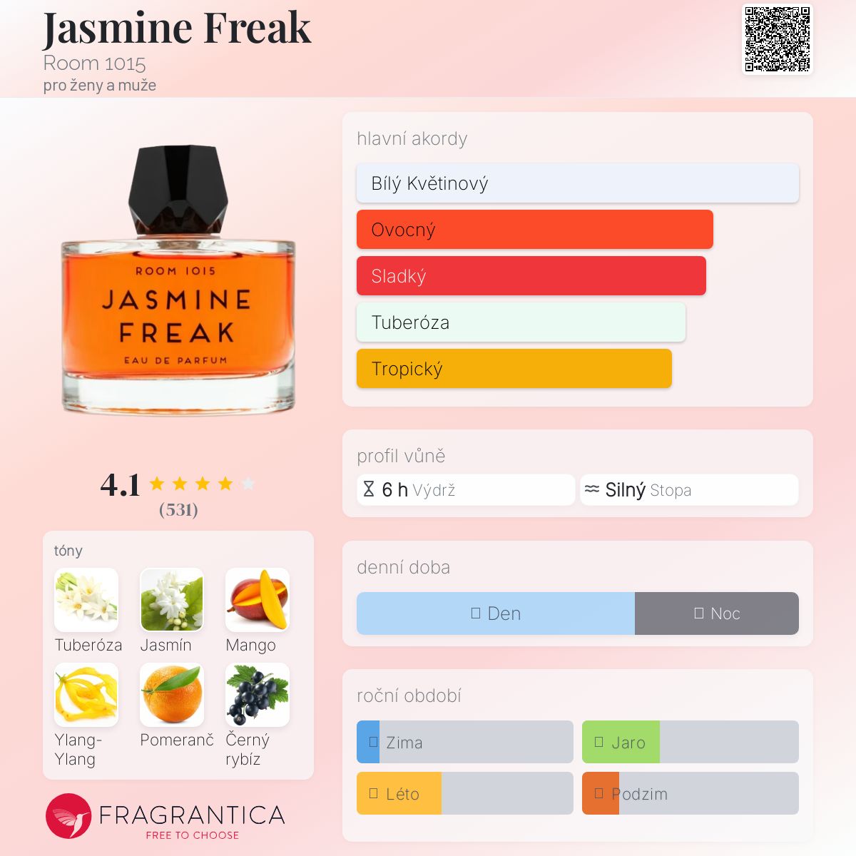 Jasmine Freak podle Room 1015 je Floral Fruity vůně pro ženy a muže. Toto je nová vůně. Jasmine Freak byl/a uveden/a v roce 2025. "Nosem" za touto vůní je Jérôme di Marino. Vrchní tóny jsou Mango, Sladký pomeranč, Černý rybíz a Černý pepř; střední tóny jsouIndická tuberóza, Egyptský jasmín a Ylang-Ylang ; základní tóny jsou Pižmo a Kašmírové dřevo.
