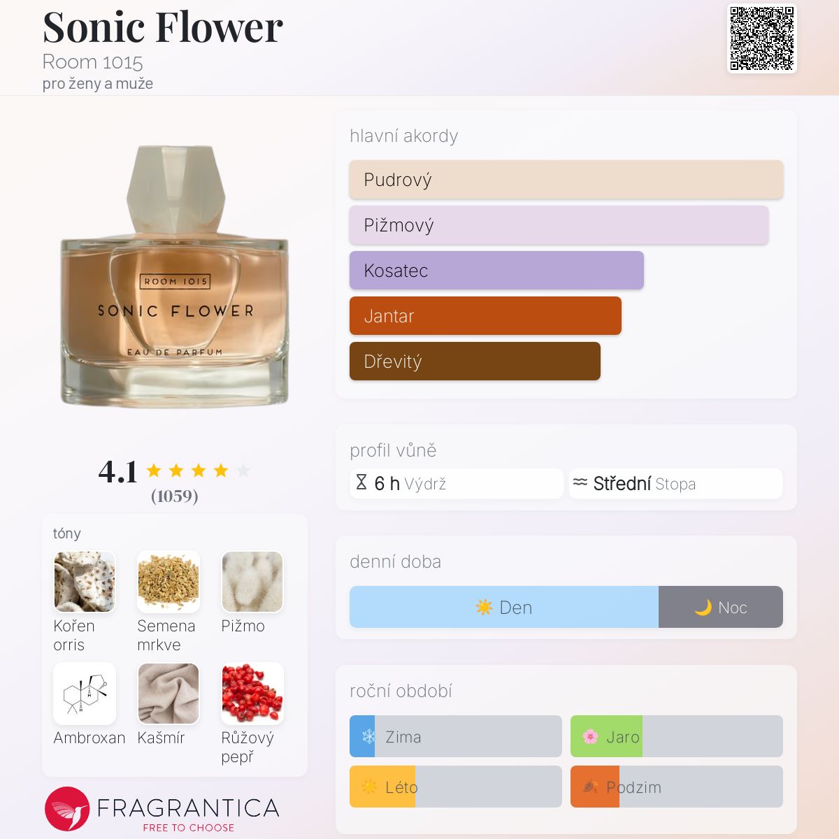 Sonic Flower podle Room 1015 je Floral Woody Musk vůně pro ženy a muže. Sonic Flower byl/a uveden/a v roce 2023. "Nosem" za touto vůní je Jérôme Epinette. Vrchní tóny jsou Semena mrkve a Růžový pepř; střední tóny jsouOrris a Jasmín ; základní tóny jsou Pižmo, Ambroxan a Kašmír.