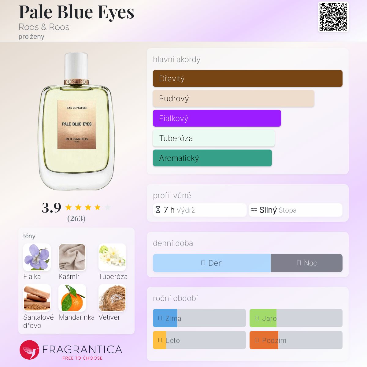 Pale Blue Eyes podle Roos & Roos je Orientální Floral vůně pro ženy. Pale Blue Eyes byl/a uveden/a v roce 2019. "Nosem" za touto vůní je Dominique Ropion. Vrchní tóny jsou Mandarinka a Černý rybíz; střední tóny jsouFialka a Tuberóza ; základní tóny jsou Kašmír, Santalové dřevo a Vetiver.