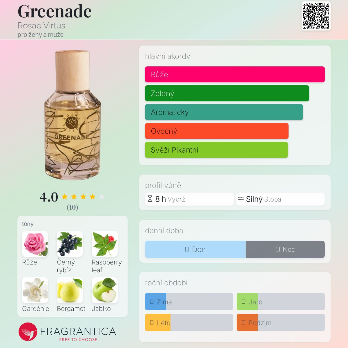 Greenade podle Rosae Virtus je Aromatic Green vůně pro ženy a muže. Toto je nová vůně. Greenade byl/a uveden/a v roce 2025. "Nosem" za touto vůní je Claudio Zucca.
