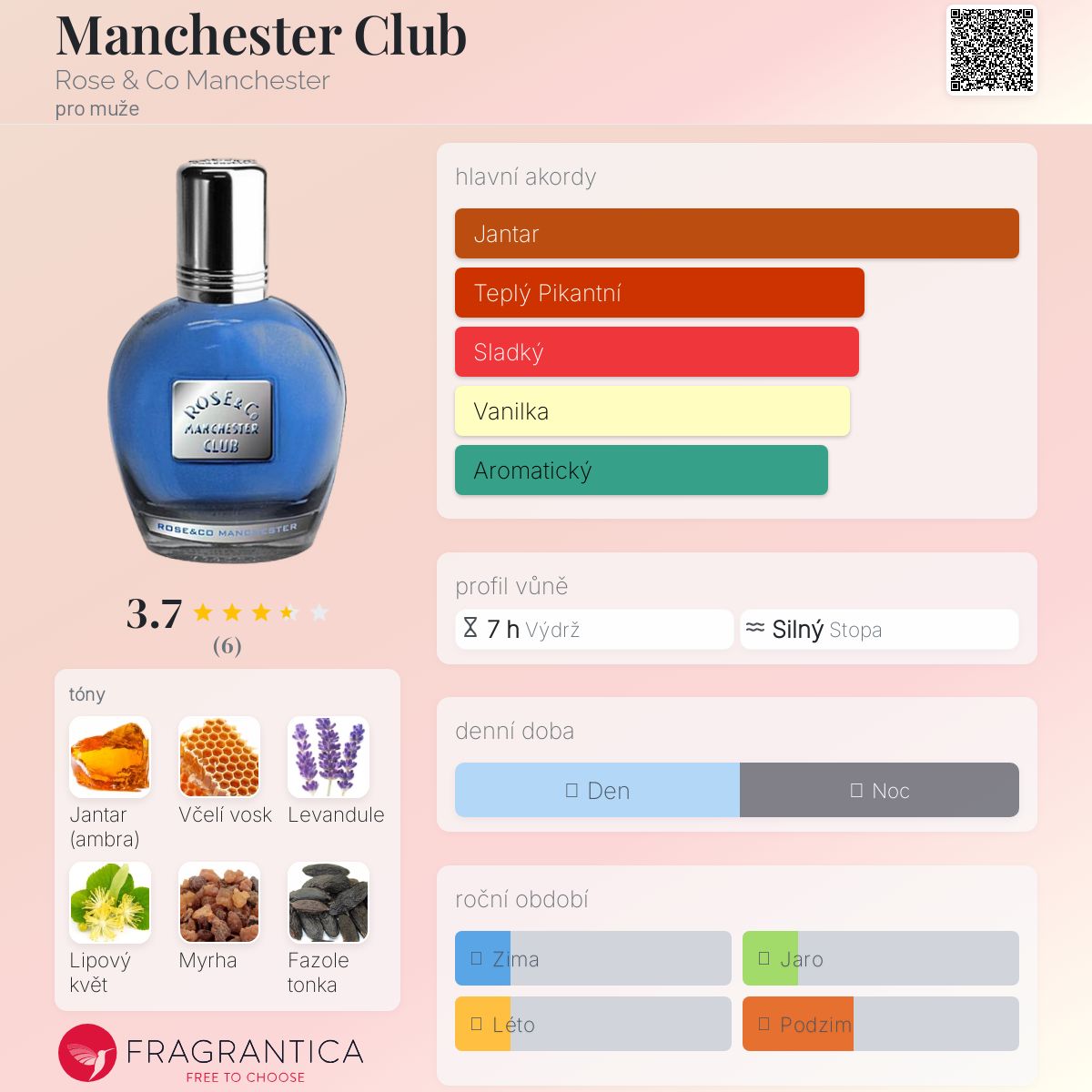 Manchester Club podle Rose & Co Manchester je Woody Spicy vůně pro muže. Manchester Club byl/a uveden/a v roce 2017. "Nosem" za touto vůní je Maurizio Cerizza. Vrchní tóny jsou Levandule, Ozonové tóny, Neroli, Kardamom, Zázvor a Fialkový list; střední tóny jsouVčelí vosk, Lipový květ, Myrha a Kůže ; základní tóny jsou Bílý jantar (ambra), Fazole tonka, Vanilka, Pačuli, Dřevité tóny, Mech a Pižmo.