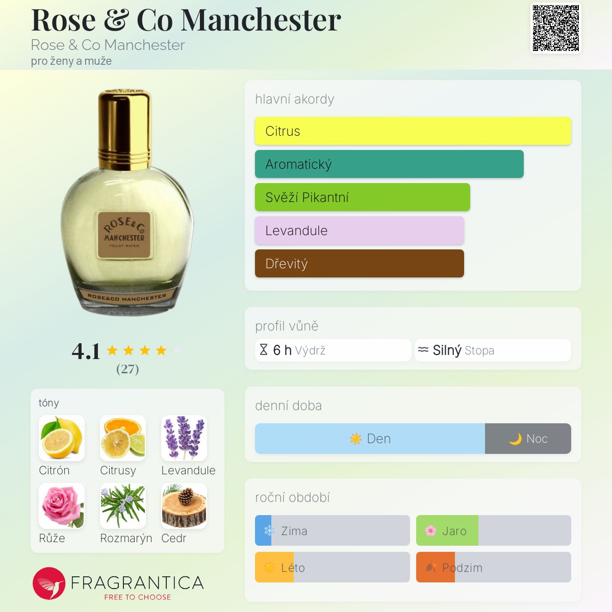 Rose & Co Manchester podle Rose & Co Manchester je Orientální Floral vůně pro ženy a muže. Rose & Co Manchester byl/a uveden/a v roce 1985. Vrchní tóny jsou Citrón, Citrusy, Rozmarýn a Cedr; střední tóny jsouLevandule, Růže a Pomerančový květ ; základní tóny jsou Fazole tonka, Pižmo a Ambra.