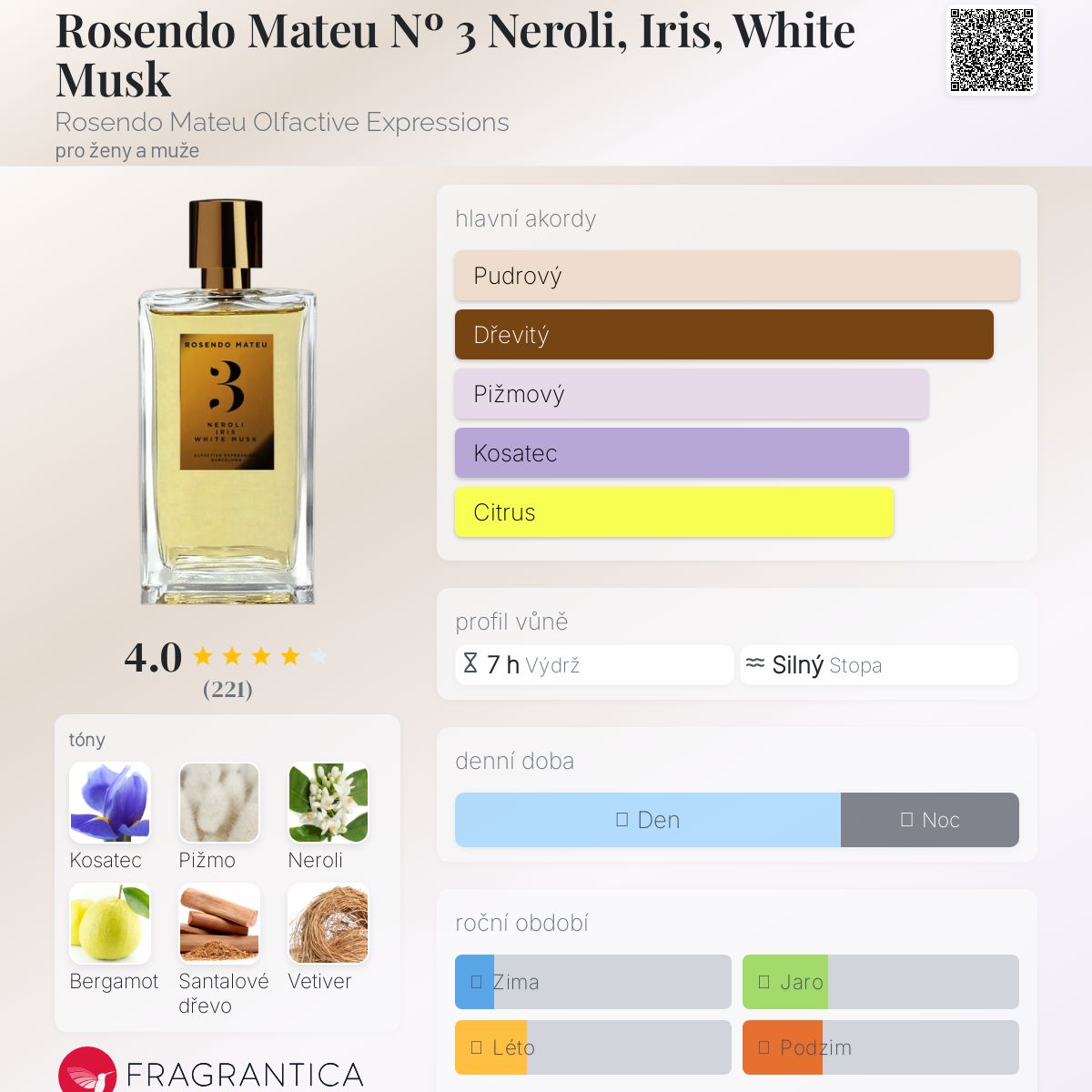 Rosendo Mateu Nº 3 Neroli, Iris, White Musk podle Rosendo Mateu Olfactive Expressions je Floral Woody Musk vůně pro ženy a muže. Rosendo Mateu Nº 3 Neroli, Iris, White Musk byl/a uveden/a v roce 2017. "Nosem" za touto vůní je Rosendo Mateu. Vrchní tóny jsou Tuniské neroli a Sicilský bergamot; střední tóny jsouKosatec, Jasmín a Damašská růže ; základní tóny jsou Bílé pižmo, Santalové dřevo, Vetiver, Vanilka, Kašmírové dřevo, Fazole tonka a Jantar (ambra).