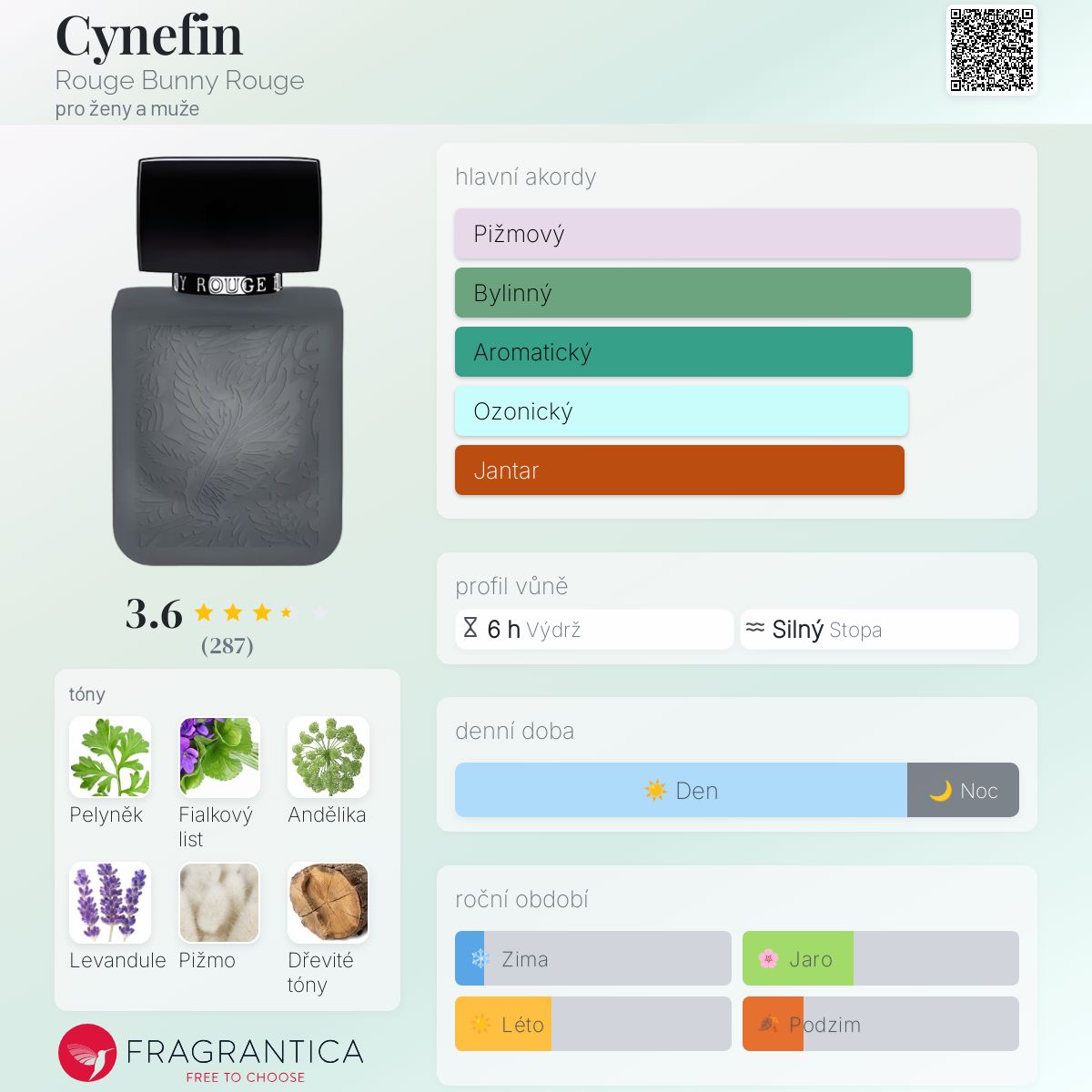 Cynefin podle Rouge Bunny Rouge je Woody Aromatic vůně pro ženy a muže. Cynefin byl/a uveden/a v roce 2013. Vrchní tóny jsou Pelyněk a Andělika; střední tóny jsouFialkový list, Levandule a Konvalinka ; základní tóny jsou Pižmo, Dřevité tóny a Jantar (ambra).