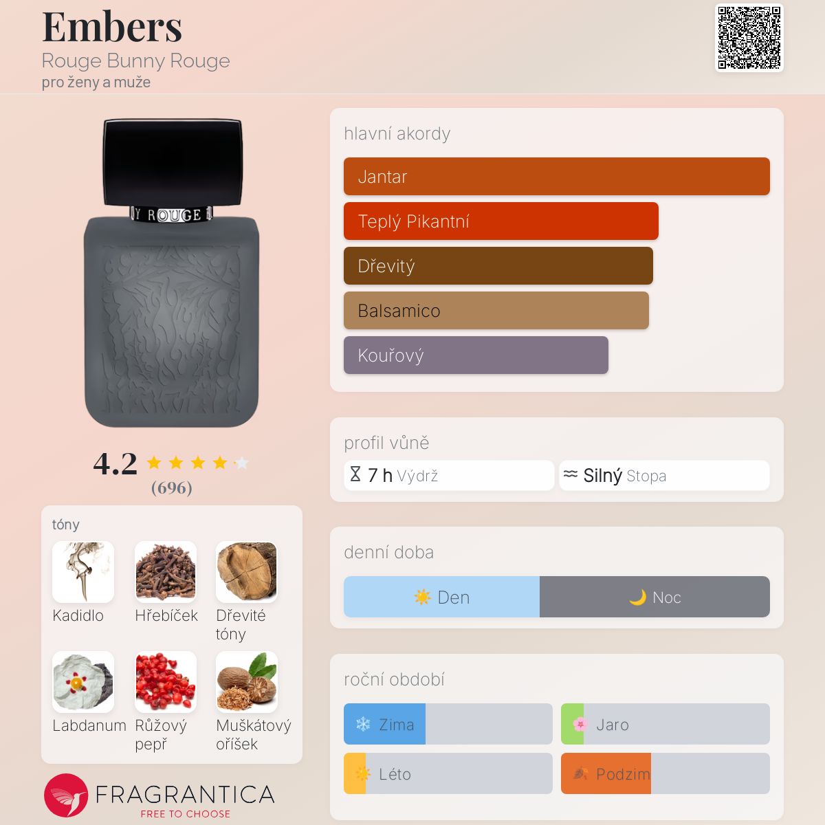 Embers podle Rouge Bunny Rouge je Orientální Spicy vůně pro ženy a muže. Embers byl/a uveden/a v roce 2013. Vrchní tóny jsou Hřebíček, Růžový pepř a Muškátový oříšek; střední tóny jsouKadidlo, Labdanum, Jasmín a Frézie ; základní tóny jsou Dřevité tóny, Peruánský balzám a Styrax.