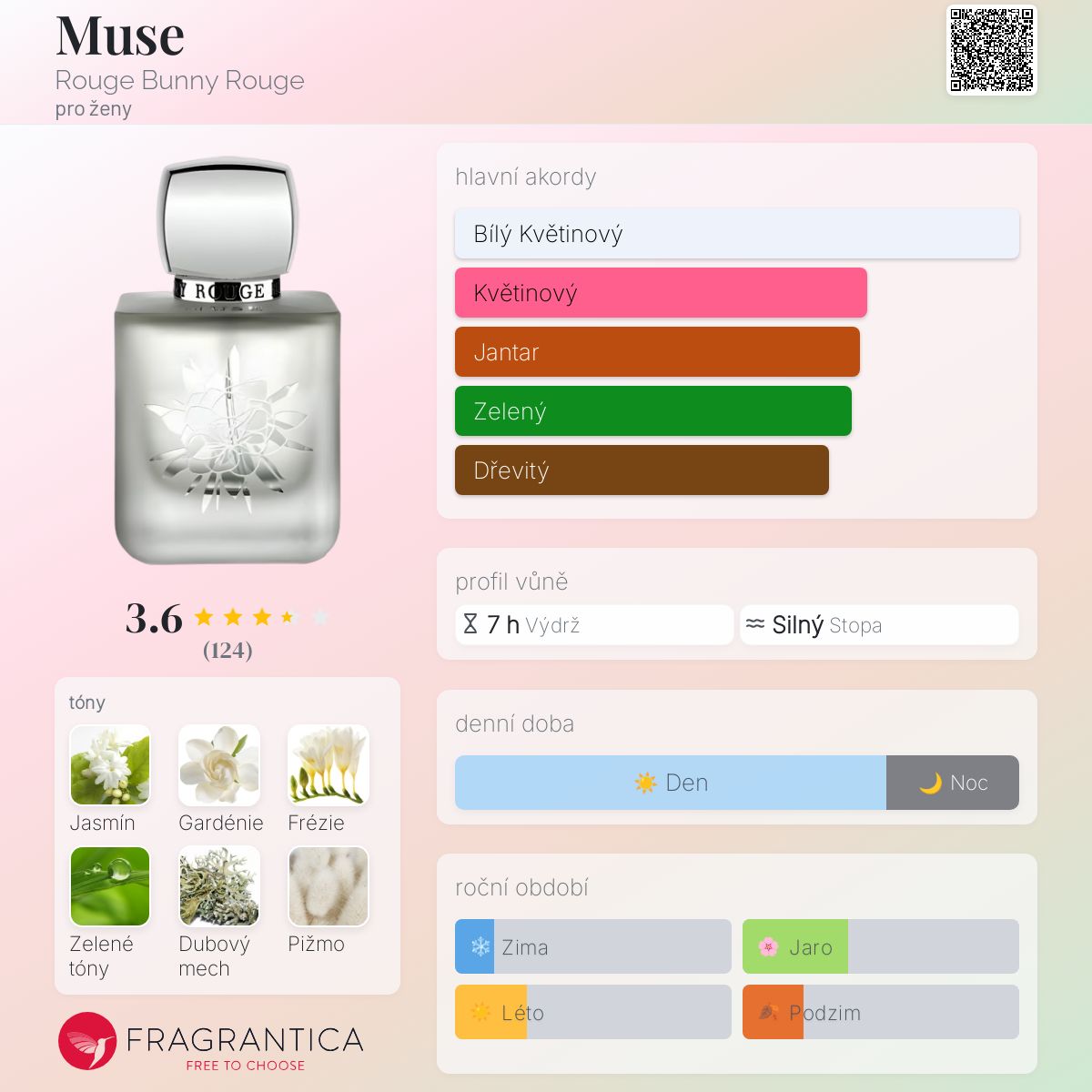 Muse podle Rouge Bunny Rouge je Chypre Floral vůně pro ženy. Muse byl/a uveden/a v roce 2014. Vrchní tóny jsou Gardénie, Frézie, Zelené listí a Bergamot; střední tóny jsouJasmín, Mech a Labdanum ; základní tóny jsou Pižmo, Ambra, Cedr a Agarové dřevo (oud).