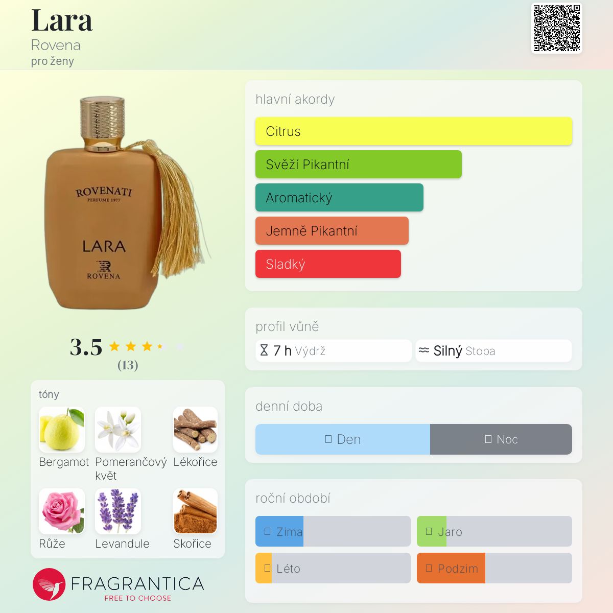 Lara podle Rovena je Orientální Floral vůně pro ženy. Lara byla spuštěna během 2020. Vrchní tóny jsou Bergamot, Pomerančový květ, Bulharská růže, Levandule, Skořice a Květiny; střední tóny jsouLékořice, Egyptský jasmín a Květiny ;