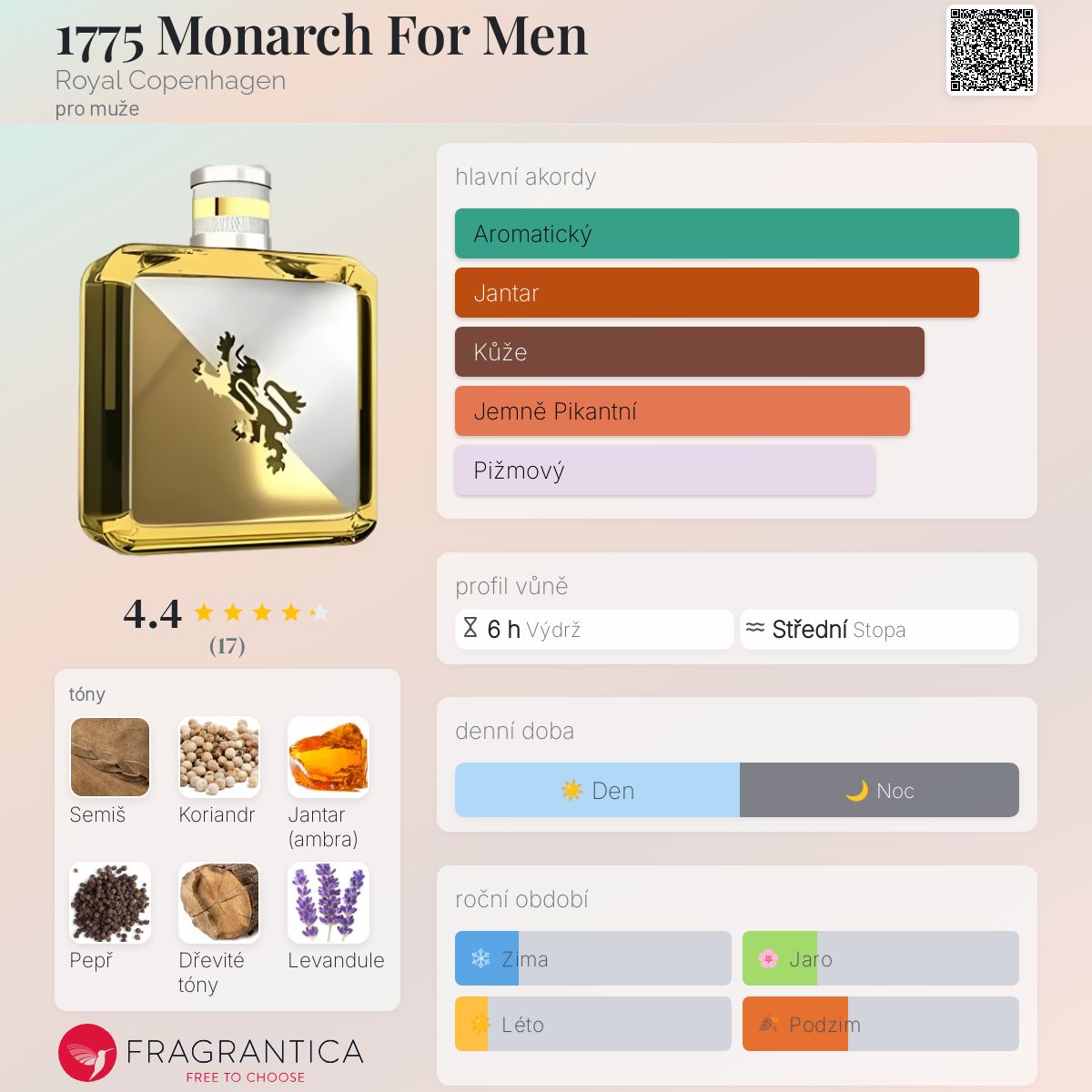 1775 Monarch For Men podle Royal Copenhagen je Woody Spicy vůně pro muže. 1775 Monarch For Men byl/a uveden/a v roce 2017. "Nosem" za touto vůní je Catherine Selig. Vrchní tóny jsou Bílý pepř, Hořký pomeranč a Máta; střední tóny jsouKoriandr, Levandule a Šalvěj ; základní tóny jsou Semiš, Bílý jantar (ambra) a Bílé dřevo.