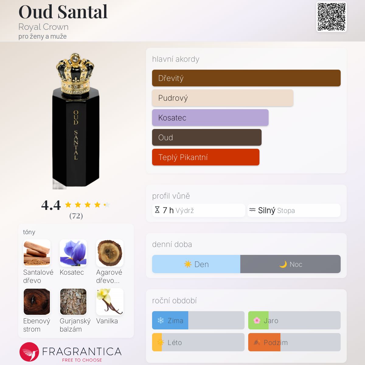 Oud Santal podle Royal Crown je Woody Spicy vůně pro ženy a muže. Oud Santal byl/a uveden/a v roce 2016. "Nosem" za touto vůní je Antonio Visconti. Vrchní tóny jsou Santalové dřevo, Styrax, Šalvěj muškátová a Kmín; střední tóny jsouSantalové dřevo, Toskánský kosatec a Jasmín Sambac ; základní tóny jsou Agarové dřevo (oud), Ebenový strom, Gurjanský balzám, Vanilka a Šedé pižmo.