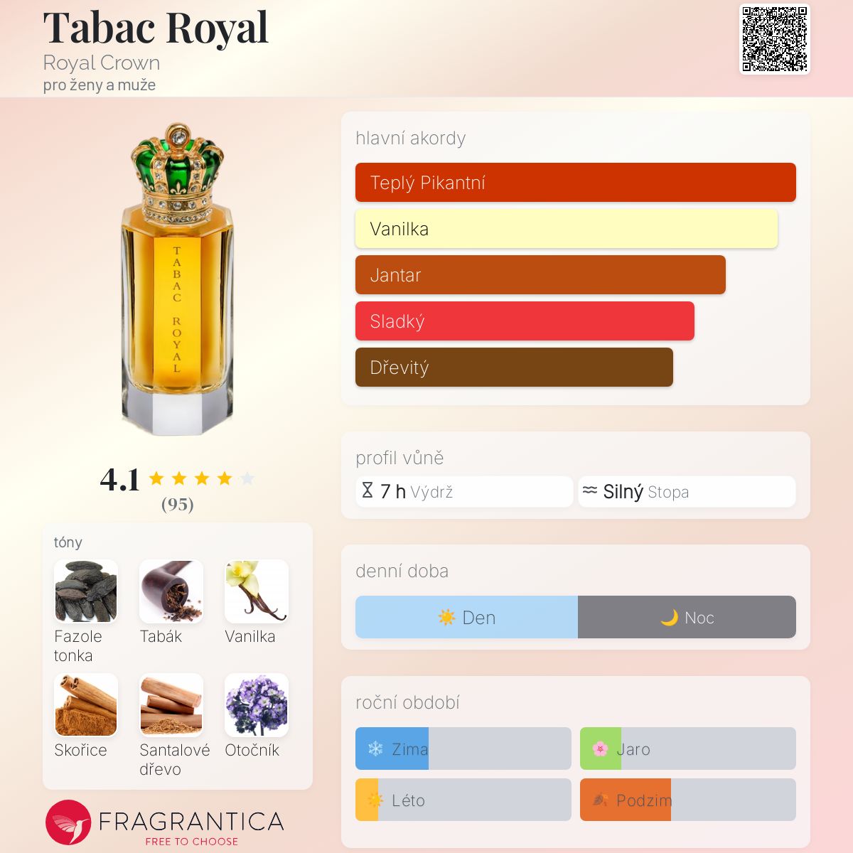 Tabac Royal podle Royal Crown je Woody Floral Musk vůně pro ženy a muže. Tabac Royal byl/a uveden/a v roce 2011. "Nosem" za touto vůní je Antonio Visconti. Vrchní tóny jsou Tabák, Skořice, Citrón, Růžový pepř a Hřebíček; střední tóny jsouFazole tonka, Tabákový list, Vanilka a Otočník ; základní tóny jsou Tabák, Santalové dřevo, Olibanum, Pačuli a Myrha.