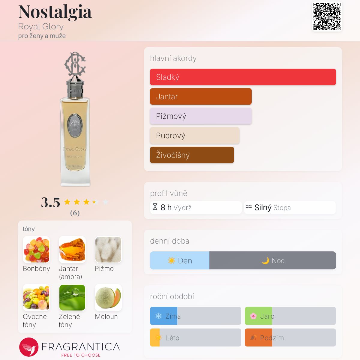 Nostalgia podle Royal Glory je Orientální Vanilla vůně pro ženy a muže. Nostalgia byl/a uveden/a v roce 2021. Vrchní tóny jsou Ovocné tóny, Zelené tóny a Bergamot; střední tóny jsouSladké tóny, Jantar (ambra), Meloun a Ananas ; základní tóny jsou Pižmo, Vanilka a Dřevité tóny.
