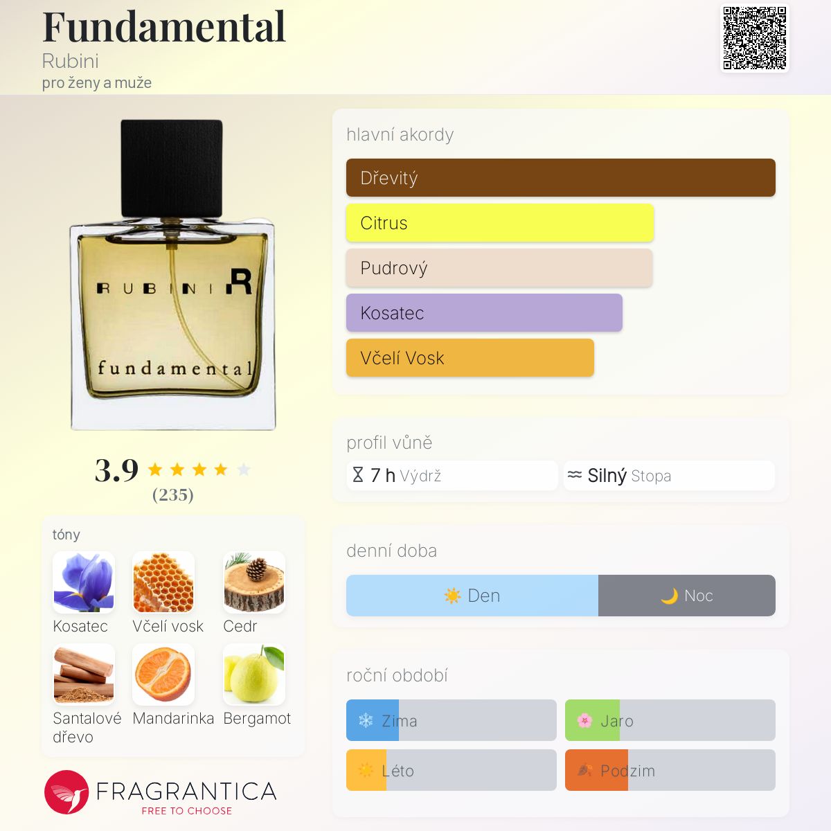 Fundamental podle Rubini je Woody Aromatic vůně pro ženy a muže. Fundamental byl/a uveden/a v roce 2015. "Nosem" za touto vůní je Cristiano Canali. Vrchní tóny jsou Mandarinka, Kalábrijský bergamot a Květiny; střední tóny jsouToskánský kosatec, Včelí vosk a Bílé hrozny ; základní tóny jsou Cedr, Santalové dřevo, Kůže a Java vetiverový olej.