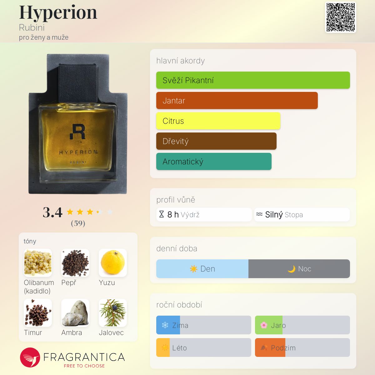 Hyperion podle Rubini je Orientální Woody vůně pro ženy a muže. Toto je nová vůně. Hyperion byl/a uveden/a v roce 2024. "Nosem" za touto vůní je Cristiano Canali.