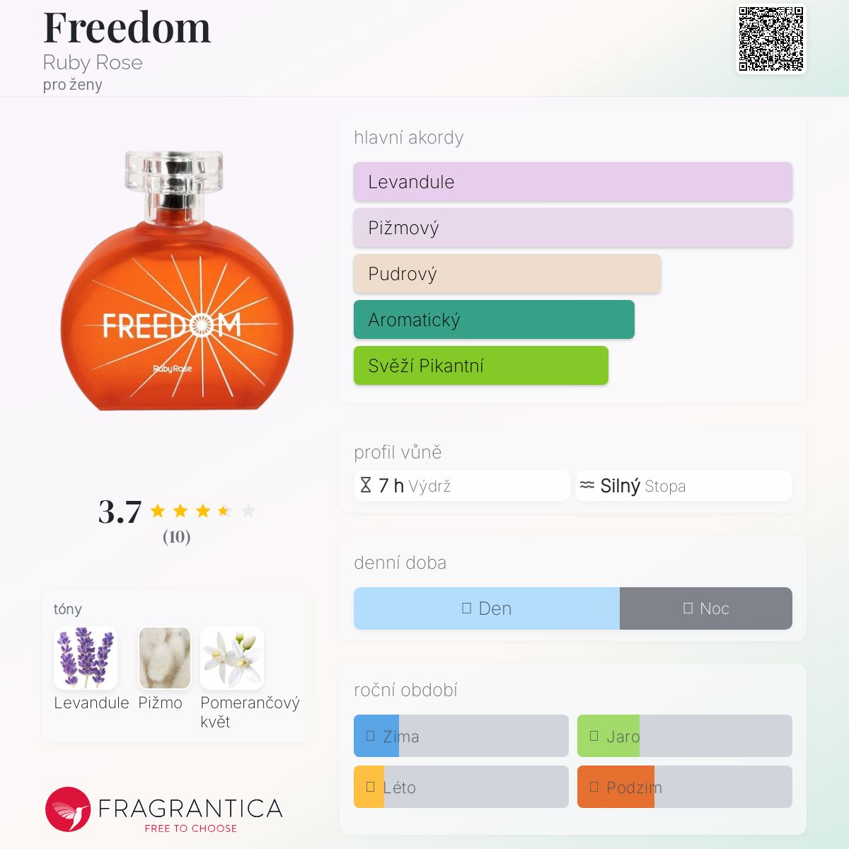 Freedom podle Ruby Rose je Floral vůně pro ženy. Freedom byl/a uveden/a v roce 2022. "Nosem" za touto vůní je Felipe Del Vigna. Vrchní tón je Levandule ; střední tón jePomerančový květ ; základní tón je Pižmo.