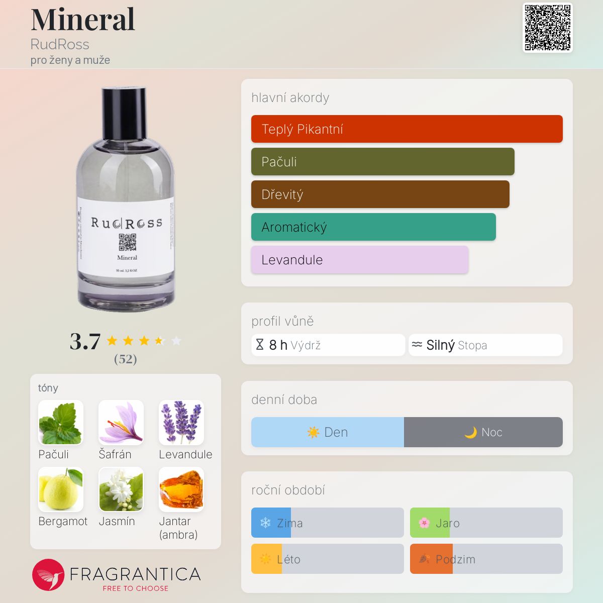 Mineral podle RudRoss je Floral vůně pro ženy a muže. Mineral byl/a uveden/a v roce 2023. Vrchní tóny jsou Levandule, Bergamot a Mandarinka; střední tóny jsouPačuli, Jasmín a Růže ; základní tóny jsou Šafrán, Jantar (ambra), Koriandr a Borovice.