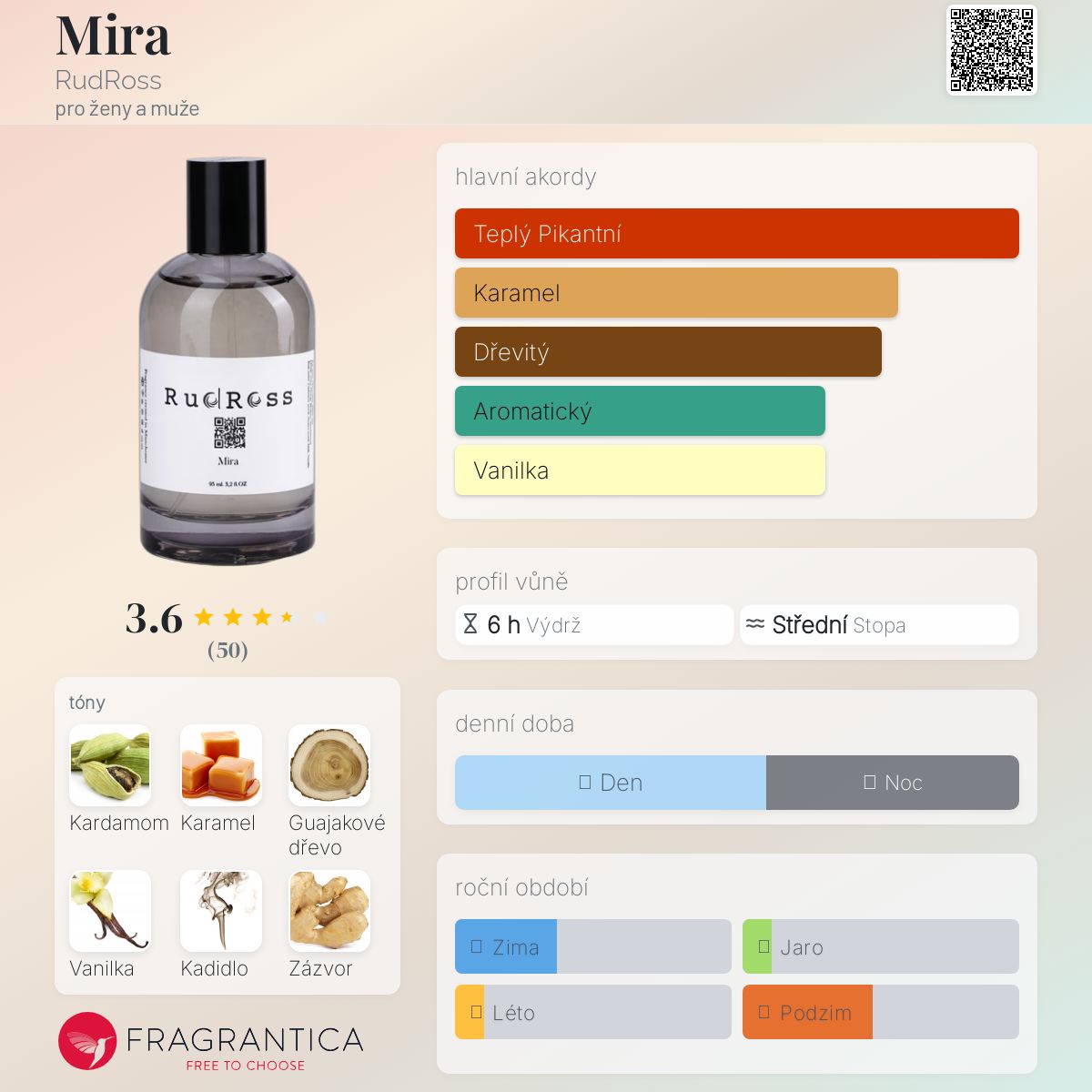 Mira podle RudRoss je Orientální Vanilla vůně pro ženy a muže. Toto je nová vůně. Mira byl/a uveden/a v roce 2025. Vrchní tóny jsou Kardamom a Zázvor; střední tóny jsouKaramel, Ylang-Ylang a Petalia ; základní tóny jsou Guajakové dřevo, Vanilka a Kadidlo.