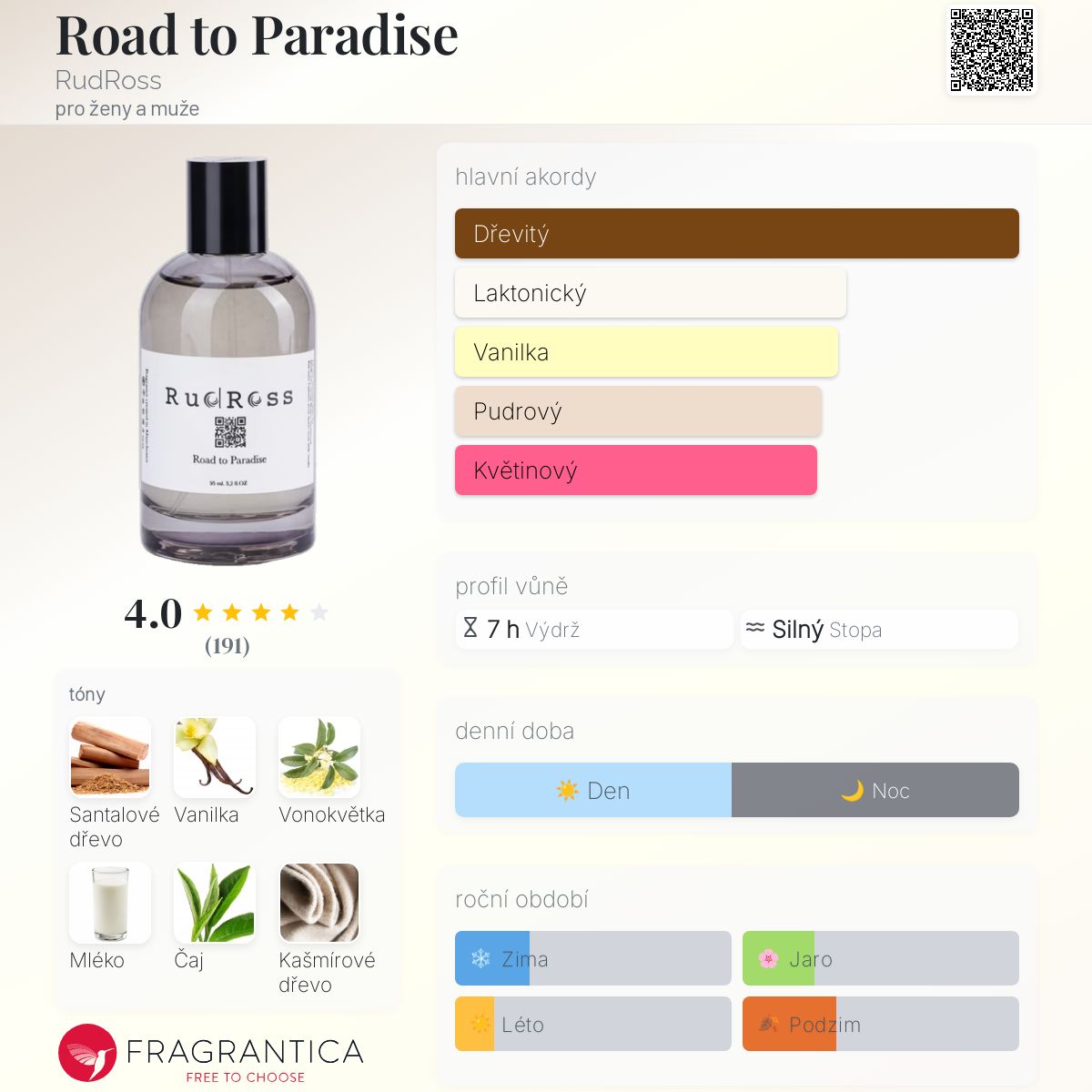 Road to Paradise podle RudRoss je Woody vůně pro ženy a muže. Road to Paradise byl/a uveden/a v roce 2023. Vrchní tóny jsou Vonokvětka a Bílý čaj; střední tóny jsouSantalové dřevo a Pomerančový květ ; základní tóny jsou Vanilka, Mléko, Kašmírové dřevo a Jantarové dřevo.