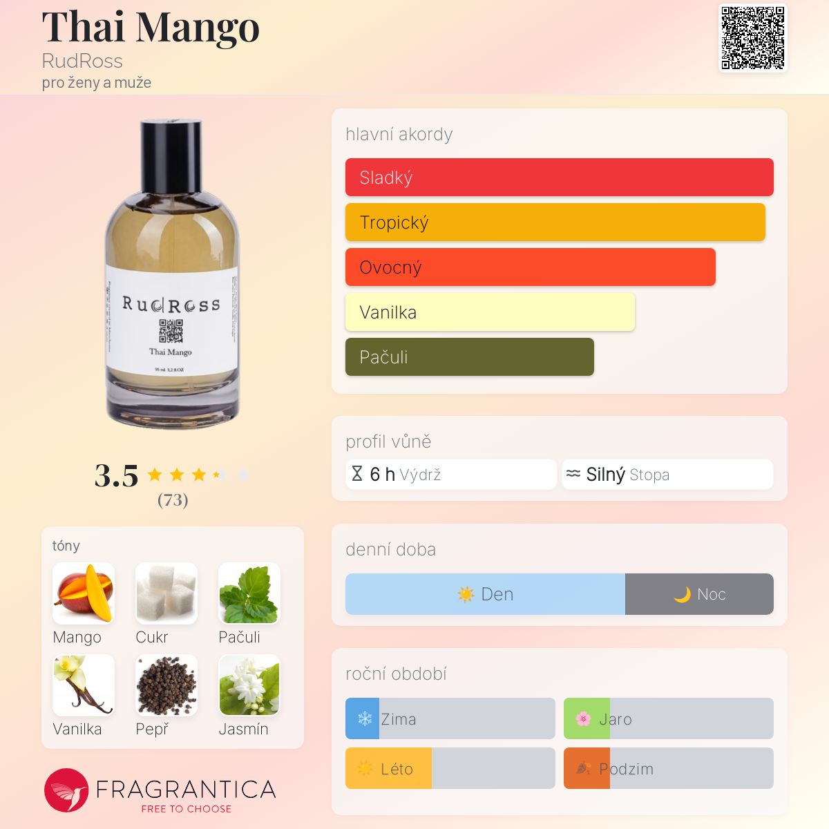 Thai Mango podle RudRoss je Floral Fruity vůně pro ženy a muže. Thai Mango byl/a uveden/a v roce 2023. Vrchní tóny jsou Mango a Černý pepř; střední tóny jsouJasmín, Orris a Lotus ; základní tóny jsou Cukr, Pačuli a Vanilka.