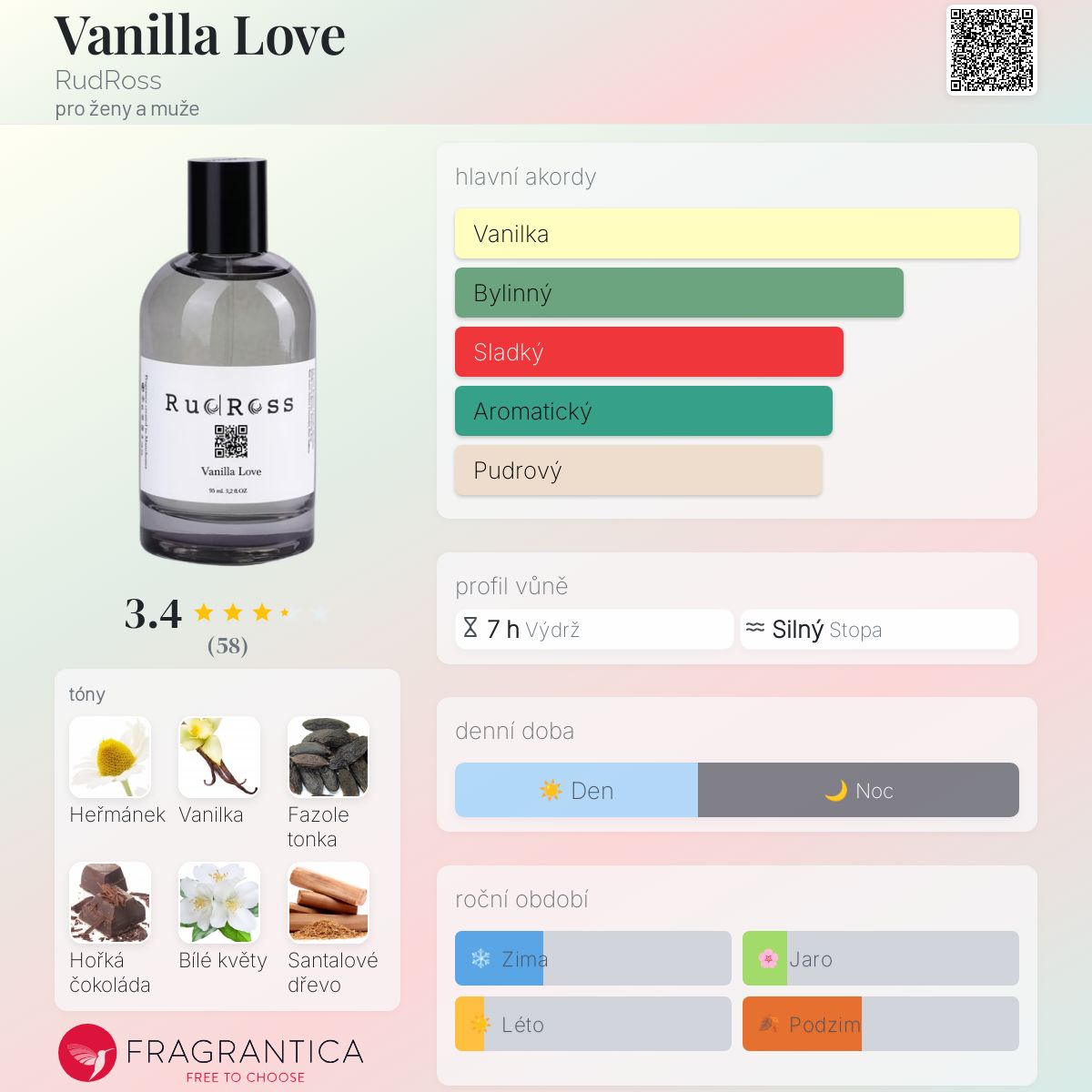 Vanilla Love podle RudRoss je Orientální Vanilla vůně pro ženy a muže. Toto je nová vůně. Vanilla Love byl/a uveden/a v roce 2024. Vrchní tóny jsou Vanilka, Mléčná čokoláda a Bergamot; střední tóny jsouHeřmánek, Bílé květy a Hedione ; základní tóny jsou Fazole tonka, Santalové dřevo a Pižmo.