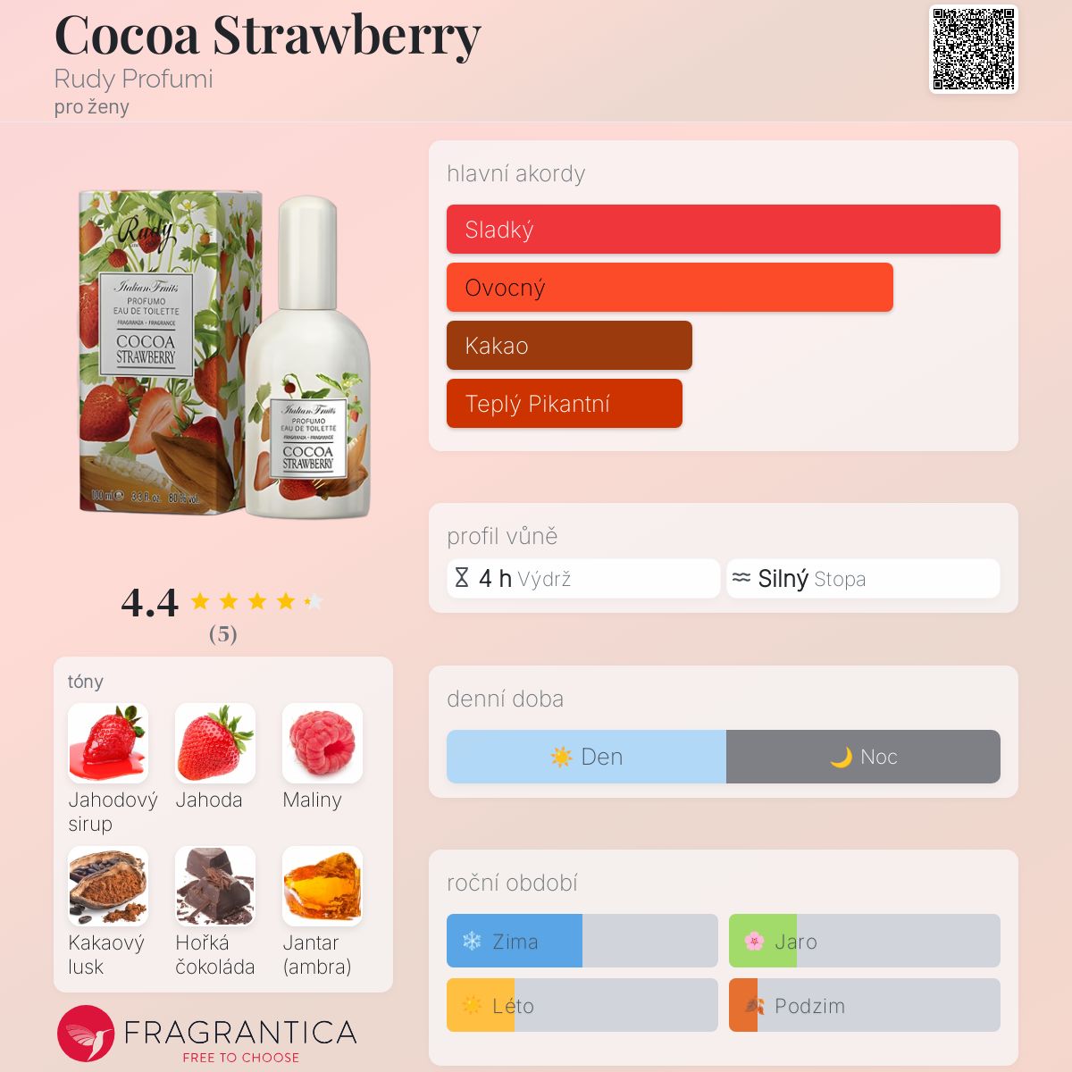 Cocoa Strawberry podle Rudy Profumi je Floral Fruity Gourmand vůně pro ženy. Vrchní tóny jsou Jahodový sirup, Jahoda a Maliny; střední tóny jsouKakao a Mléčná čokoláda ; základní tóny jsou Jantar (ambra), Vanilka, Slad a Med.