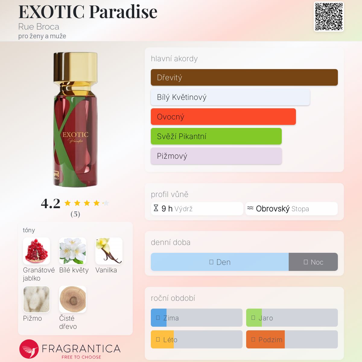 EXOTIC Paradise podle Rue Broca je Orientální Vanilla vůně pro ženy a muže. EXOTIC Paradise byl/a uveden/a v roce 2023. Vrchní tón je Granátové jablko ; střední tóny jsouBílé květy a Vanilka ; základní tóny jsou Pižmo a Čisté dřevo.