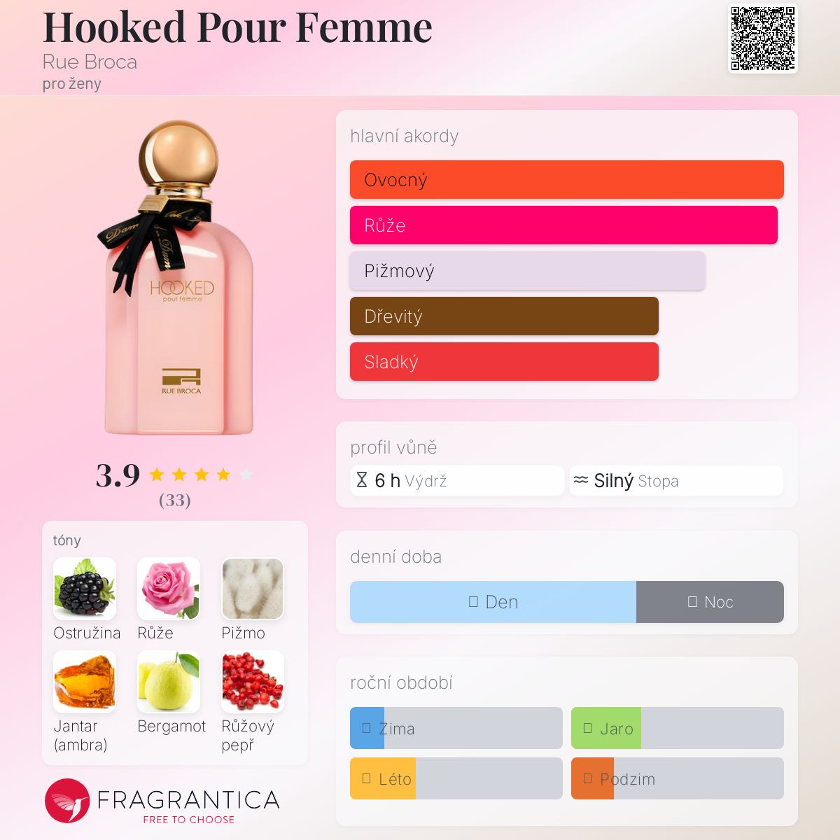 Hooked Pour Femme podle Rue Broca je vůně pro ženy. Hooked Pour Femme byla spuštěna během 2020. Vrchní tóny jsou Ostružina, Bergamot a Růžový pepř; střední tóny jsouRůže, Dřevité tóny a Cypřiš ; základní tóny jsou Pižmo, Jantar (ambra) a Vetiver.