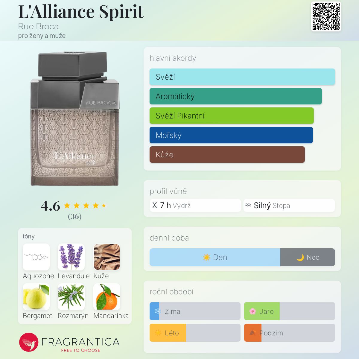 L'Alliance Spirit podle Rue Broca je Woody Aromatic vůně pro ženy a muže. Toto je nová vůně. L'Alliance Spirit byl/a uveden/a v roce 2024. Vrchní tóny jsou Aquozone, Bergamot a Mandarinka; střední tóny jsouLevandule, Rozmarýn a Masticha ; základní tóny jsou Kůže, Pačuli, Jantar (ambra) a Pižmo.