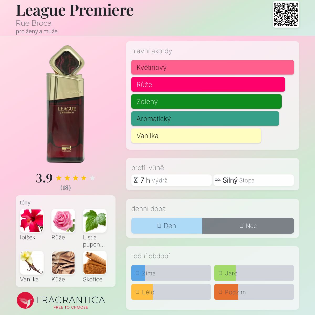 League Premiere podle Rue Broca je Orientální Floral vůně pro ženy a muže. Toto je nová vůně. League Premiere byl/a uveden/a v roce 2024. Vrchní tóny jsou Ibišek a Růže; střední tóny jsouČerný rybíz, Vanilka a Kůže ; základní tóny jsou Skořice, Pikantní máta a Pižmo.