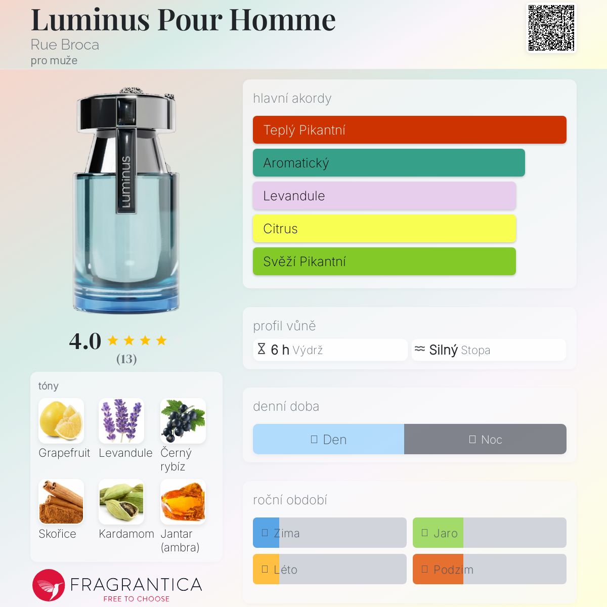 Luminus Pour Homme podle Rue Broca je Woody Spicy vůně pro muže. Toto je nová vůně. Luminus Pour Homme byl/a uveden/a v roce 2025. Vrchní tóny jsou Černý rybíz, Skořice a Muškátový oříšek; střední tóny jsouGrapefruit, Levandule a Kardamom ; základní tóny jsou Jantar (ambra), Pačuli, Pižmo a Dubový mech.