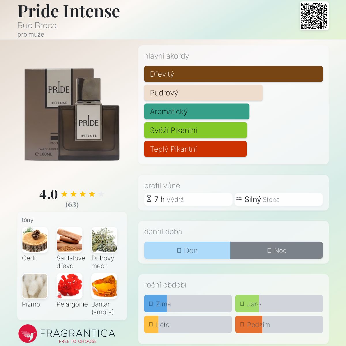 Pride Intense podle Rue Broca je Orientální Woody vůně pro muže. Pride Intense byl/a uveden/a v roce 2015. Vrchní tóny jsou Pelargónie, Jablko a Levandule; střední tóny jsouSantalové dřevo, Jantar (ambra) a Pačuli ; základní tóny jsou Cedr, Mech a Pižmo.