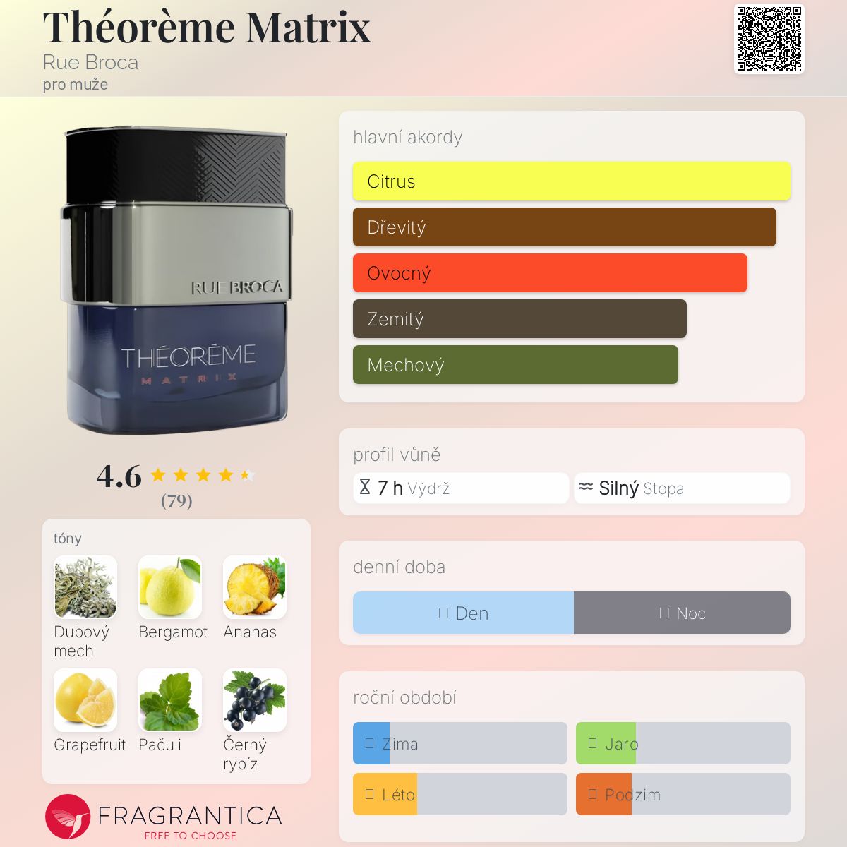 Théorème Matrix podle Rue Broca je Woody Spicy vůně pro muže. Toto je nová vůně. Théorème Matrix byl/a uveden/a v roce 2024. "Nosem" za touto vůní je Imran Fazlani. Vrchní tóny jsou Bergamot, Ananas, Grapefruit a Černý rybíz; střední tóny jsouPačuli, Levandule, Jasmín a Cedr ; základní tóny jsou Dubový mech, Šafrán, Pižmo a Dřevité tóny.