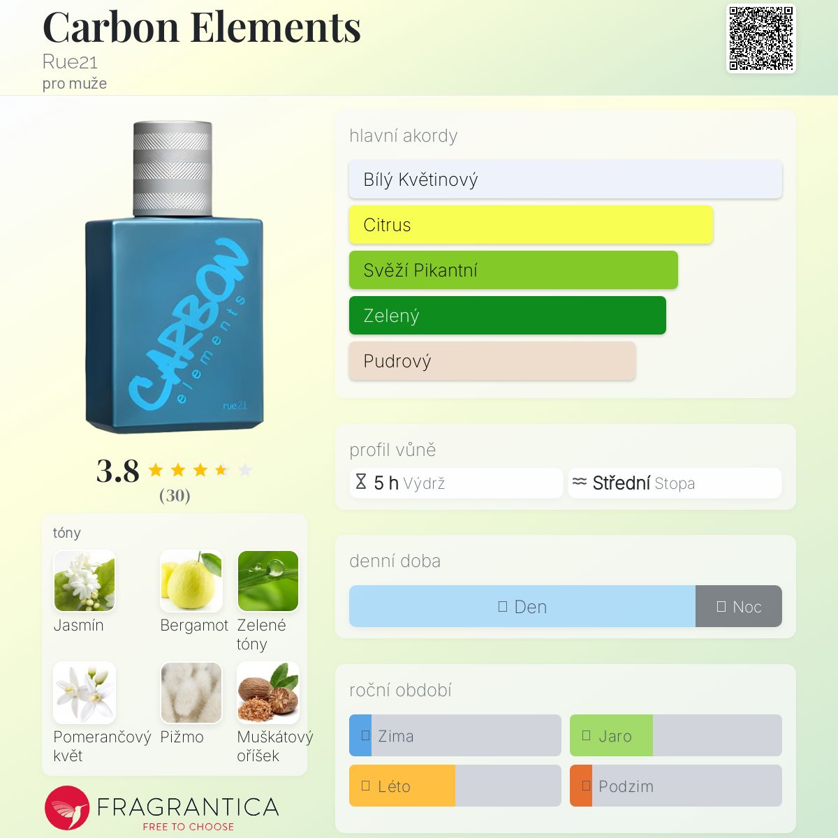 Carbon Elements podle Rue21 je Aromatic Spicy vůně pro muže. Carbon Elements byl/a uveden/a v roce 2010. Vrchní tóny jsou Bergamot a Zelené tóny; střední tóny jsouJasmín, Květ afrického pomeranče a Muškátový oříšek ; základní tóny jsou Pižmo a Santalové dřevo.