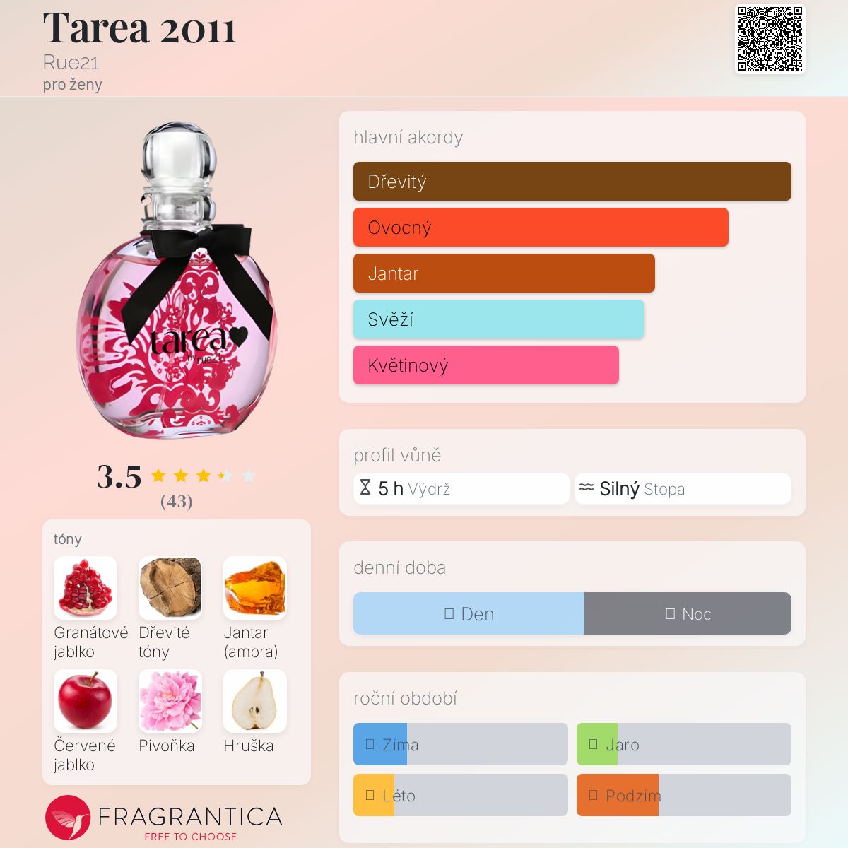 Tarea 2011 podle Rue21 je Floral Fruity vůně pro ženy. Tarea 2011 byl/a uveden/a v roce 2011. Vrchní tóny jsou Granátové jablko, Červené jablko a Hruška; střední tóny jsouPivoňka a Jasmín ; základní tóny jsou Dřevité tóny a Jantar (ambra).