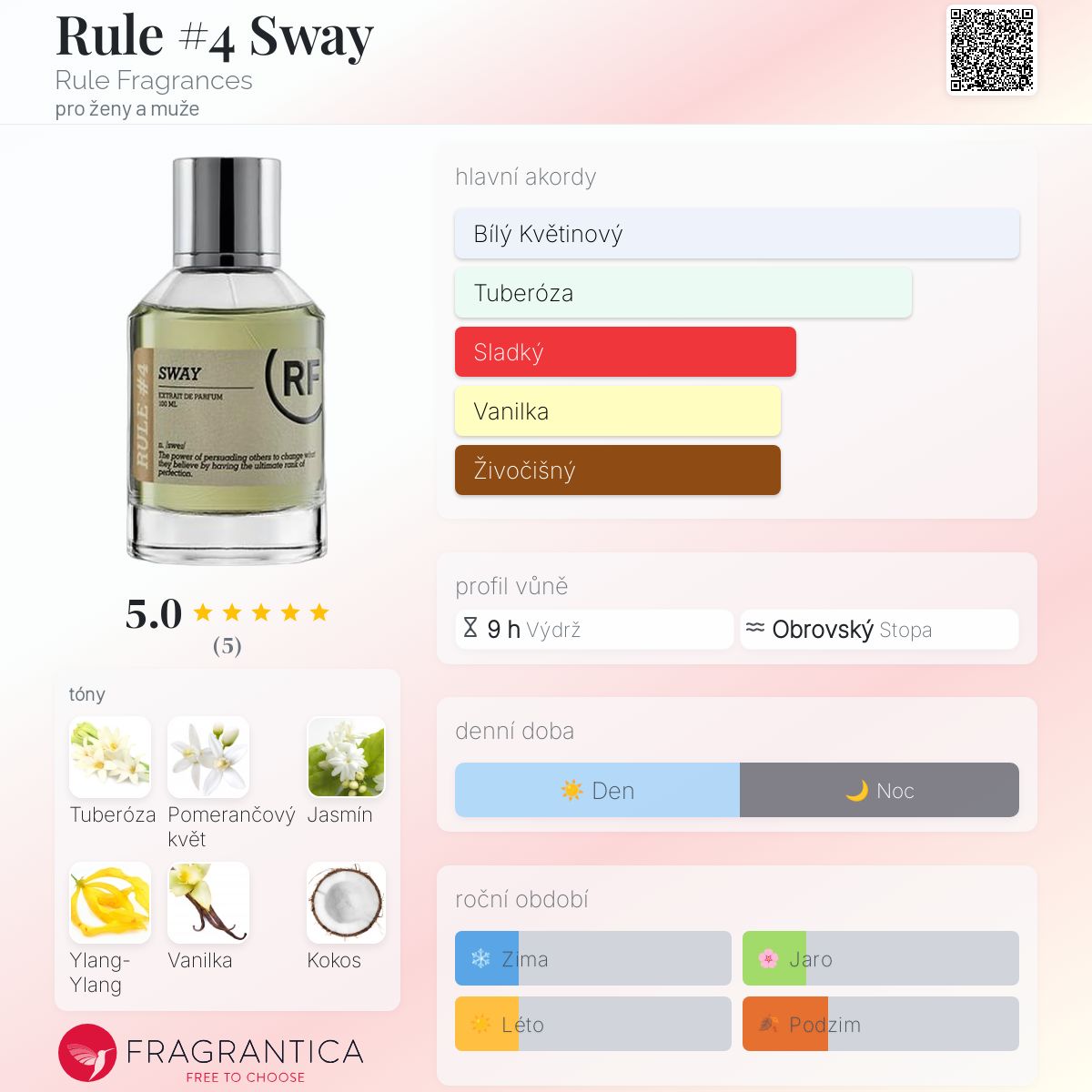 Rule #4 Sway podle Rule Fragrances je Floral vůně pro ženy a muže. Vrchní tón je Pomerančový květ ; střední tóny jsouTuberóza, Jasmín Sambac a Ylang-Ylang ; základní tóny jsou Vanilka, Kokos a Pižmo.
