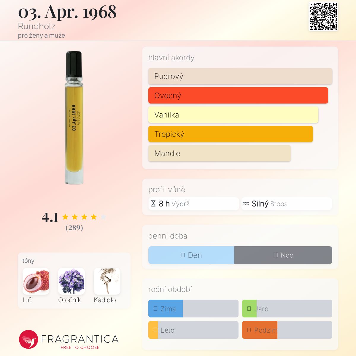 03. Apr. 1968 podle Rundholz je Orientální Floral vůně pro ženy a muže. 03. Apr. 1968 byl/a uveden/a v roce 2012. "Nosem" za touto vůní je Arturetto Landi. Vrchní tón je Liči ; střední tón jeOtočník ; základní tón je Kadidlo.