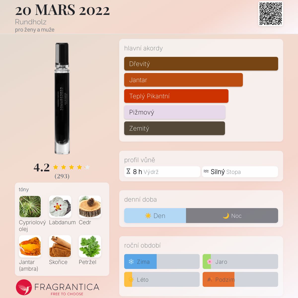 20 MARS 2022 podle Rundholz je Orientální Woody vůně pro ženy a muže. 20 MARS 2022 byl/a uveden/a v roce 2017. "Nosem" za touto vůní je Arturetto Landi. Vrchní tóny jsou Skořice, Petržel, Šafrán, Jahoda, Černý pepř a Růžový pepř; střední tóny jsouKonvalinka, Růže a Jasmín ; základní tóny jsou Cypriolový olej, Labdanum, Cedr, Jantar (ambra), Seno, Kastoreum, Vetiver, Fazole tonka, Pačuli, Cibetka, Pižmo, Santalové dřevo, Vanilka a Kadidlo.