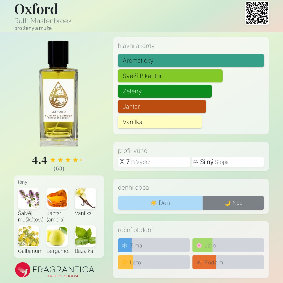 Oxford podle Ruth Mastenbroek je Orientální vůně pro ženy a muže. Oxford byl/a uveden/a v roce 2015. "Nosem" za touto vůní je Ruth Mastenbroek. Vrchní tóny jsou Galbanum, Bergamot a Bazalka; střední tóny jsouŠalvěj muškátová, Rozmarýn, Levandule a Jasmín ; základní tóny jsou Jantar (ambra), Vanilka, Vetiver a Agarové dřevo (oud).