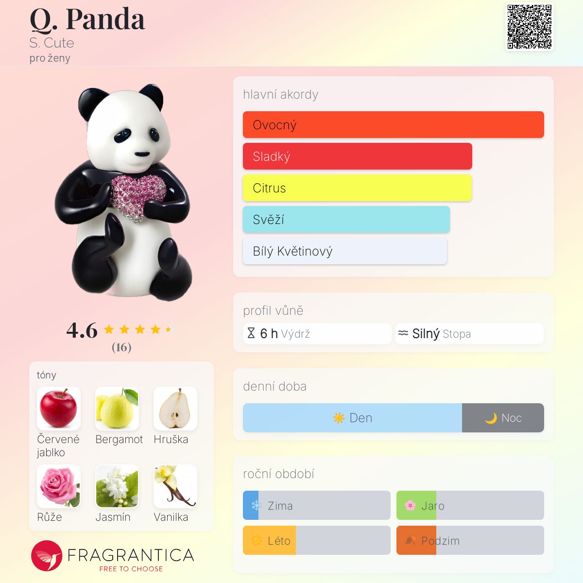 Q. Panda podle S. Cute je Floral Fruity vůně pro ženy. Q. Panda byl/a uveden/a v roce 2009. Vrchní tóny jsou Červené jablko, Bergamot a Hruška; střední tóny jsouRůže, Jasmín a Konvalinka ; základní tóny jsou Vanilka, Vetiver a Santalové dřevo.