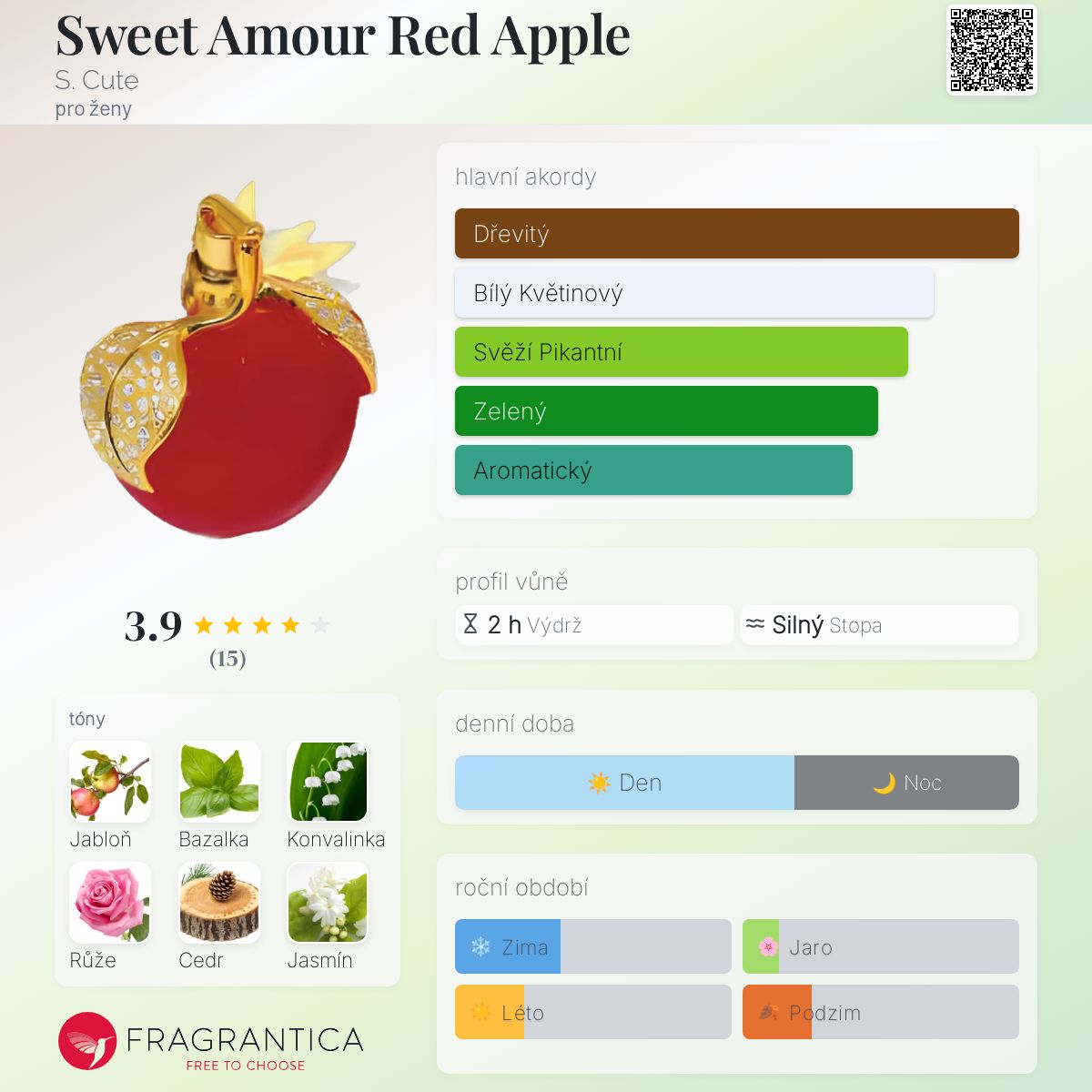 Sweet Amour Red Apple podle S. Cute je Floral vůně pro ženy. Sweet Amour Red Apple byl/a uveden/a v roce 2009. Vrchní tóny jsou Jabloň a Bazalka; střední tóny jsouKonvalinka, Růže a Jasmín ; základní tóny jsou Virginský cedr a Pižmo.