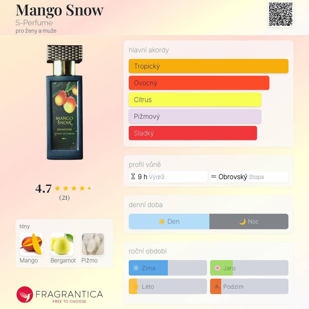 Mango Snow podle S-Perfume je vůně pro ženy a muže. Mango Snow byl/a uveden/a v roce 2023. Vrchní tóny jsou Mango a Bergamot; základní tón je Pižmo.