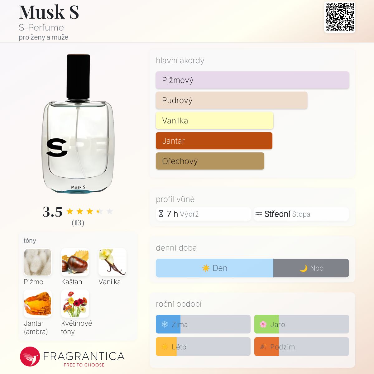 Musk S podle S-Perfume je Floral Woody Musk vůně pro ženy a muže. Musk S byl/a uveden/a v roce 2014. "Nosem" za touto vůní je Carlos Benaïm.