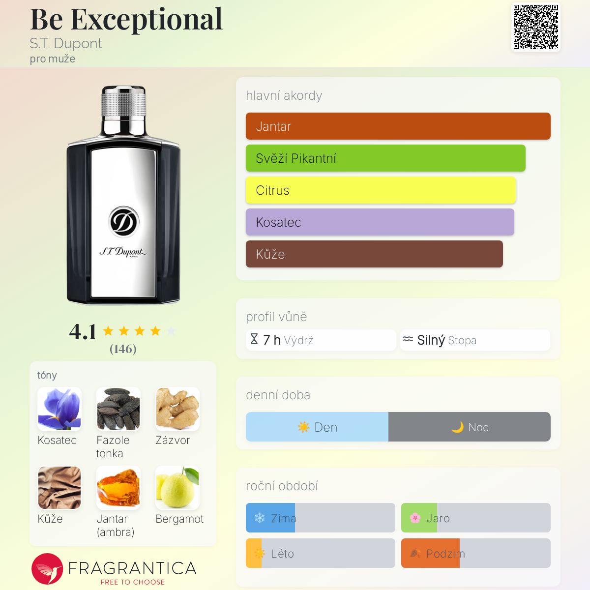 Be Exceptional podle S.T. Dupont je Orientální Woody vůně pro muže. Be Exceptional byl/a uveden/a v roce 2017. "Nosem" za touto vůní je Natalie Gracia-Cetto. Vrchní tóny jsou Zázvor, Bergamot a Grapefruit; střední tóny jsouKosatec, Fazole tonka a Kůže ; základní tóny jsou Jantar (ambra), Vetiver a Pačuli.