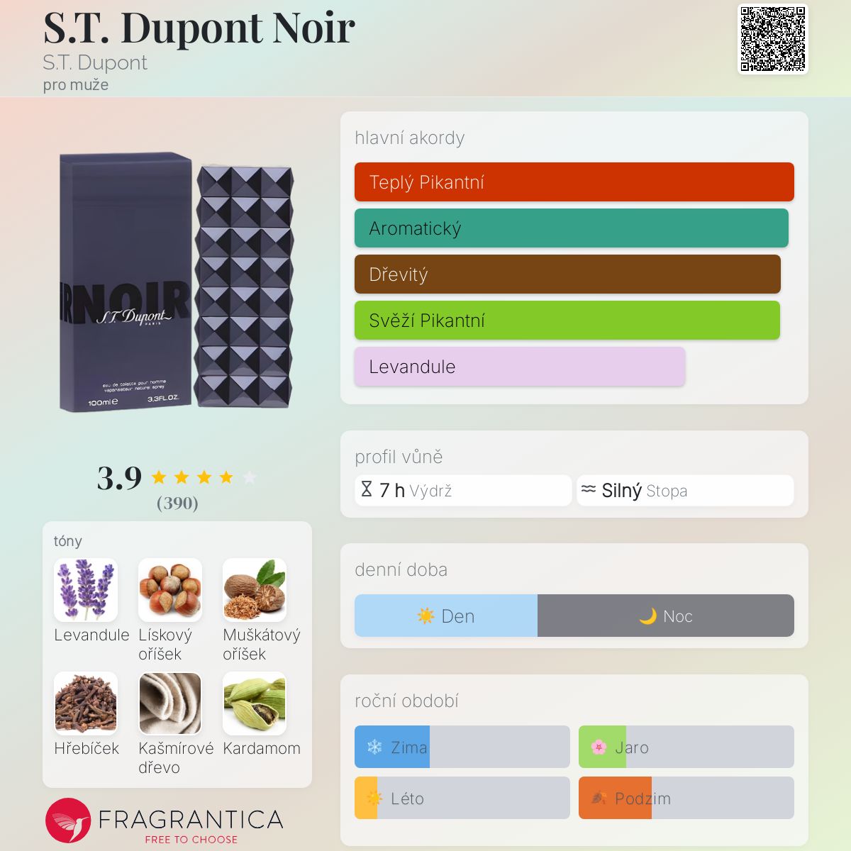 S.T. Dupont Noir podle S.T. Dupont je Woody Spicy vůně pro muže. S.T. Dupont Noir byl/a uveden/a v roce 2006. "Nosem" za touto vůní je Michel Girard. Vrchní tóny jsou Levandule, Kardamom a Máta; střední tóny jsouMuškátový oříšek a Hřebíček ; základní tóny jsou Lískový oříšek, Kašmírové dřevo a Vetiver.