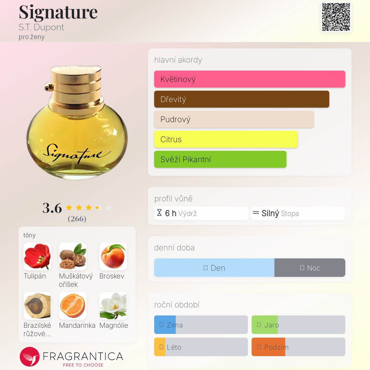 Signature podle S.T. Dupont je Floral vůně pro ženy. Signature byl/a uveden/a v roce 2000. "Nosem" za touto vůní je Bertrand Duchaufour. Vrchní tóny jsou Tulipán, Muškátový oříšek, Broskev, Mandarinka, Fialka, Bergamot a Aldehydy; střední tóny jsouMagnólie, Růže, Kosatec, Orchidej, Konvalinka a Jasmín ; základní tóny jsou Brazilské růžové dřevo, Santalové dřevo, Jantar (ambra), Vetiver, Cedr, Vanilka a Pižmo.