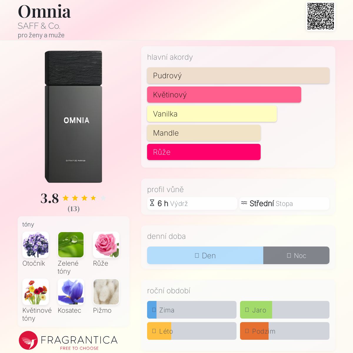 Omnia podle SAFF & Co. je Floral Woody Musk vůně pro ženy a muže. "Nosem" za touto vůní je Nanako Ogi. Vrchní tóny jsou Zelený tón a Grapefruit; střední tóny jsouRůže, Květinové tóny a Kosatec ; základní tóny jsou Otočník, Pižmo a Dřevité tóny.