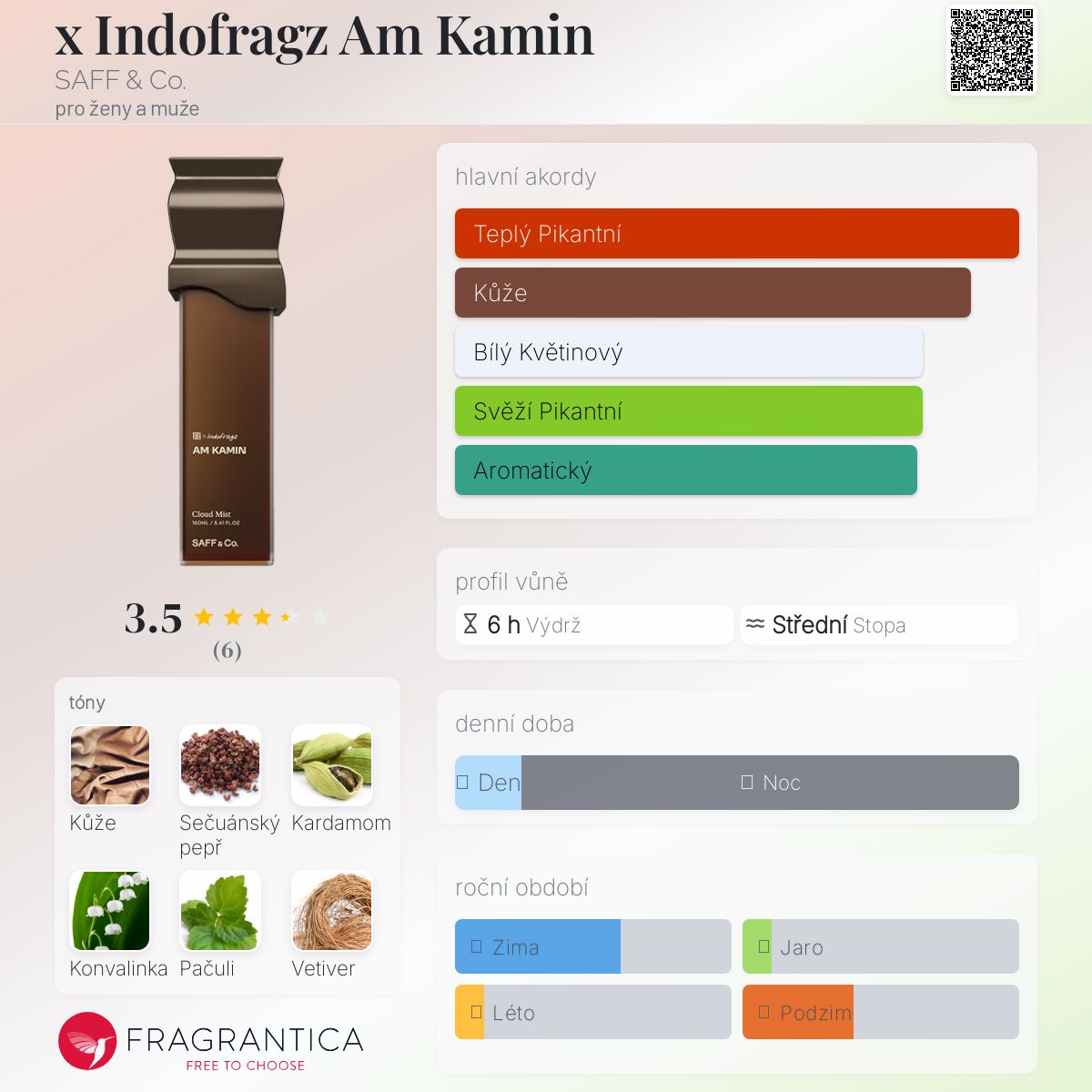 x Indofragz Am Kamin podle SAFF & Co. je Leather vůně pro ženy a muže. Toto je nová vůně. x Indofragz Am Kamin byl/a uveden/a v roce 2025. "Nosem" za touto vůní je Miroslav Petkov. Vrchní tóny jsou Sečuánský pepř, Kardamom a Tymián; střední tóny jsouKonvalinka, Pačuli a Ovocné tóny ; základní tóny jsou Kůže, Haitský vetiver a Peruánský balzám.