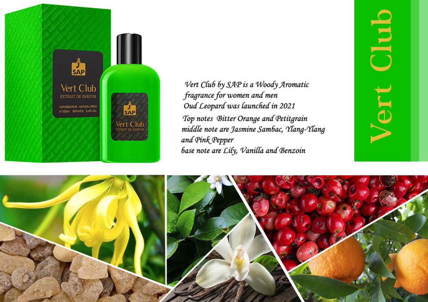 Vert Club podle SAP Perfume je Woody Aromatic vůně pro ženy a muže. Vert Club byl/a uveden/a v roce 2021. Vrchní tóny jsou Hořký pomeranč a Petitgrain; střední tóny jsouJasmín Sambac, Ylang-Ylang a Růžový pepř ; základní tóny jsou Lilie, Vanilka a Benzoin.