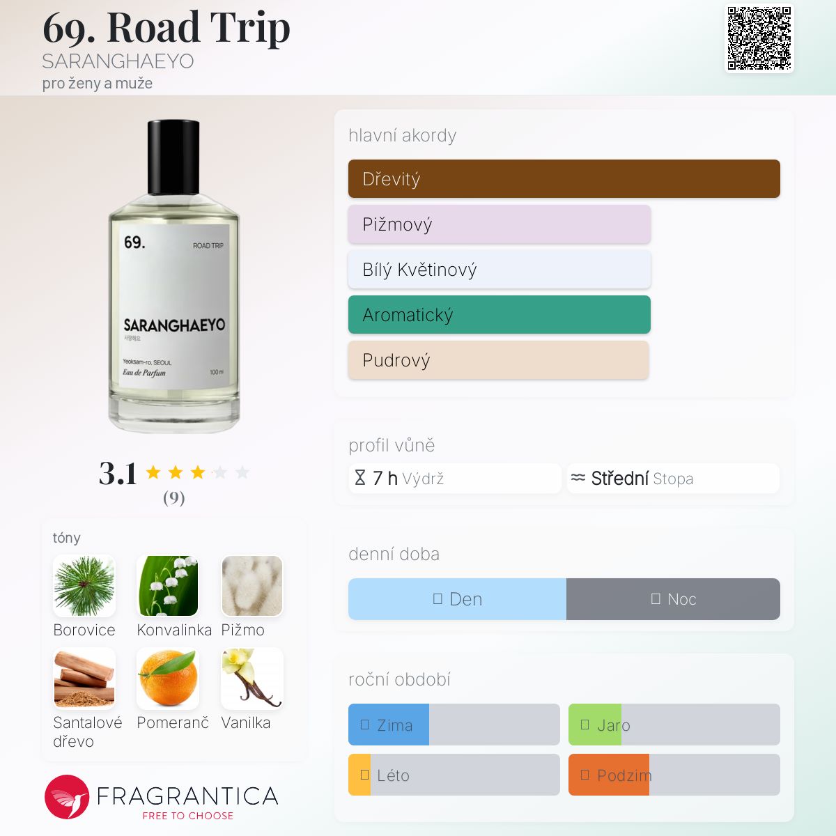 69. Road Trip podle SARANGHAEYO je vůně pro ženy a muže. 69. Road Trip byl/a uveden/a v roce 2020. Vrchní tón je Pomeranč ; střední tóny jsouBorovice a Konvalinka ; základní tóny jsou Pižmo, Santalové dřevo, Vanilka a Jantar (ambra).