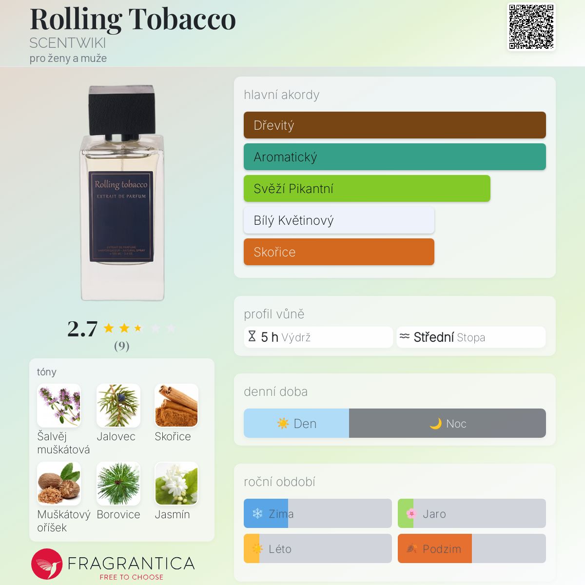 Rolling Tobacco podle SCENTWIKI je Aromatic Spicy vůně pro ženy a muže. Rolling Tobacco byl/a uveden/a v roce 2022. "Nosem" za touto vůní je Hyeeun Kim. Vrchní tóny jsou Šalvěj muškátová, Jalovec, Skořice a Muškátový oříšek; střední tóny jsouJehličí borovice a Jasmín ; základní tón je Iso E Super.